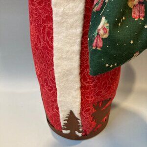 Handcrafted Santa in a metal cup with cut outs of pine trees and moose. He is one of a kind, with a soft sculpted soulful face, holding a bag of toys. He has a soft red scarf and a green felt hat, holding a wreath. The bottom is weighted and signed by the artist. Would make a good doorstop or hearth decoration, weighted. Made in the USA