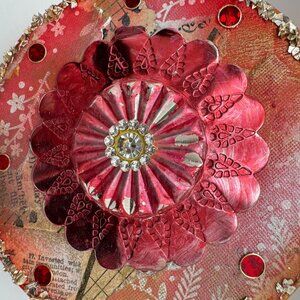 Handcrafted OOAK Red Medallion Ornament With Collage Design Floral Embellishment
