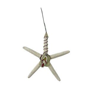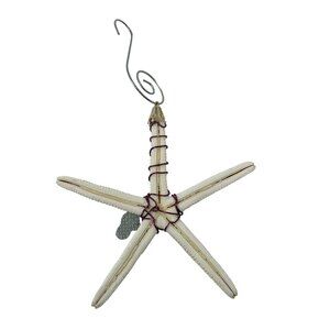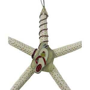 This Christmas Ornament from Sharon @ Coastal Creations is a handcrafted wire wrapped in burgundy, pencil starfish with light yellow sea glass and an a flip flop charm. Cream and Yellow in color with burgundy wire it measures 5 inches in height and width.