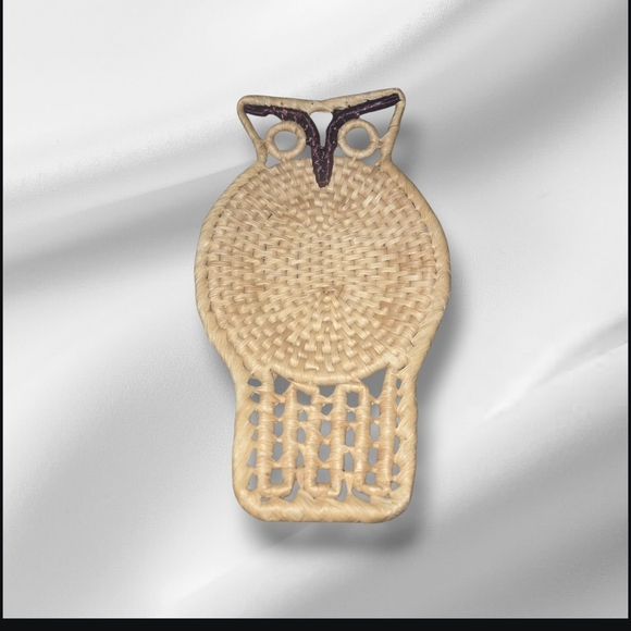 This is a vintage, hand-woven, owl-shaped grass or wicker basket that can be used as a tray or wall decor. Measures 11 x 7 inches.