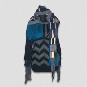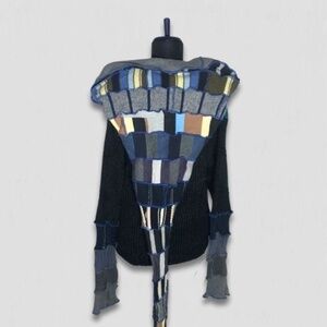 One-of-a-kind handcrafted boho sweater with a whimsical patchwork design and oversized pointy fairy elf hood. Featuring mixed knits in black, grey, blue, and teal tones, this cozy piece blends art, fashion, and comfort.