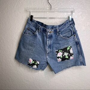 this was an ups cycle piece that I added a patchwork detail to they are super cute and very trendy they’re in great condition and have some fringe on the bottom they are jeans that were cut into shorts