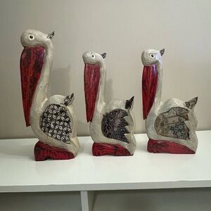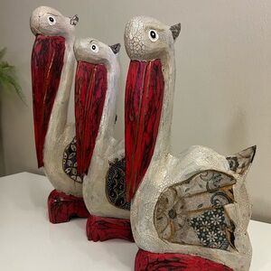 Handcrafted Pelican Figurines - Red and Cream wood material.