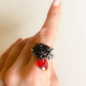 This antiqued pewter ring has a black rose at its center, and from beneath which suspends a deep red Swarovski crystal heart.