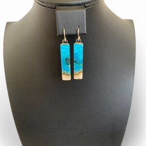 Vibrant turquoise color rectangular drop earrings featuring Chrysocolla, or Phoenix Stone as it is also known, a beautiful highly prized gemstone, blue-green in color, intergrown with quartz, chalcedony and opal. The result is a pair of earrings that resemble a serene ocean meeting the shore. Lightweight and elegant, they add a touch of artistic charm to your look. Silver metal hooks-untested. Excellent preowned condition. Some discoloration on the hooks as shown. See photos for more details.