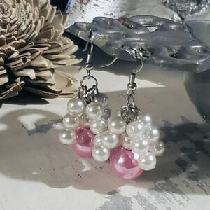 Handcrafted Pink White Glass Pearl Beads Cluster Dangle Earrings