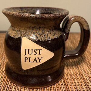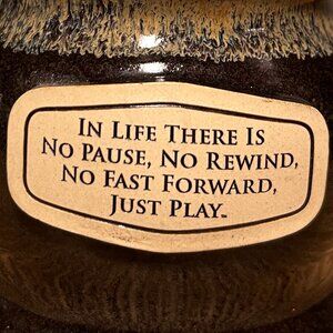 Handcrafted potbelly shaped pottery mug with two-tone glossy glaze based in dark brown and topped with a tan drip glaze. One side features a raised unglazed triangular medallion (resembling a VCR or DVD or music player play symbol button) with brown incised lettering that reads, JUST PLAY. The other side features an unglazed rectangular medallion with incised brown text that reads, IN LIFE THERE IS NO PAUSE, NO REWIND, NO FAST FORWARD, JUST PLAY. Unglazed underside features stamped brown text that reads, From the moment we are born we face the hourglass of life…No Pause, No Rewind, No Fast Forward…Just Play.