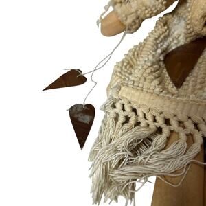 This stunning handmade primitive angel doll brings instant warmth and character to any space. Crafted with meticulous attention to detail, she features a beautifully textured cream knit dress with authentic vintage-style wooden buttons and charming fringe hem that adds movement and rustic elegance. Her wild natural fiber hair creates an enchanting bohemian look, while genuine twig wings and delicate heart cutouts give her an authentic folk art appeal. The weathered metal elements and soft fabric body showcase traditional craftsmanship that collectors and home decorators adore. Standing gracefully, this angel makes a perfect centerpiece for mantels, shelves, or seasonal displays. Her neutral cream and brown palette complements farmhouse, cottage, or rustic decor styles effortlessly. This one-of-a-kind piece radiates handmade charm and would make an exceptional gift for anyone who appreciates artisan folk art and primitive country decorating.
