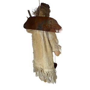 This stunning handmade primitive angel doll brings instant warmth and character to any space. Crafted with meticulous attention to detail, she features a beautifully textured cream knit dress with authentic vintage style wooden buttons and charming fringe hem that adds movement and rustic elegance. Her wild natural fiber hair creates an enchanting bohemian look, while genuine twig wings and delicate heart cutouts give her an authentic folk art appeal. The weathered metal elements and soft fabric body showcase traditional craftsmanship.