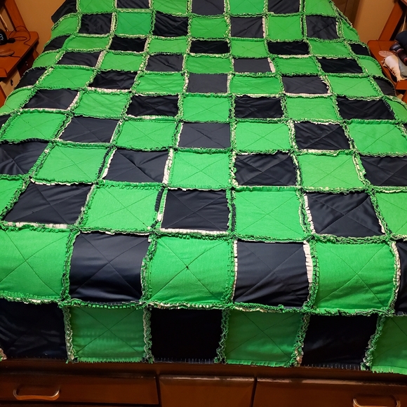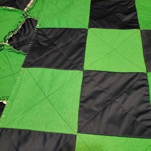 Handcrafted quilt from upcycled t-shirts and sateen table cloth that would have otherwise ended up in a landfill. Washed once to start fray, fringe will continue to fray and soften with each wash.
