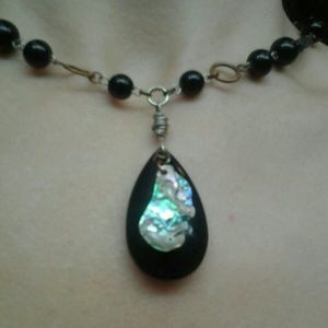 This One of a kind, Rainbow Shell & Black Glass Drop Pendant Necklace is a Beautifully Original. A Unique piece, the Shells in this Creation Catch the Sunlight & Gleem the Colors of the Rainbow. Wear with Any outfit! Style & Class.