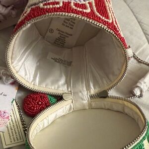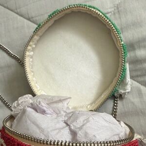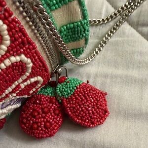 Delight in the charm of this handcrafted beaded crossbody bag, featuring a vibrant red and green raspberry jam design. Perfect for adding a playful touch to any outfit.