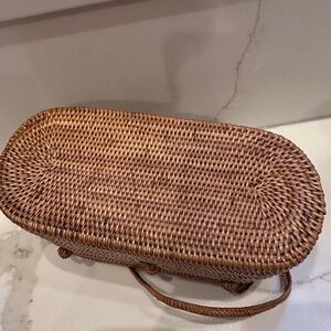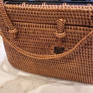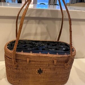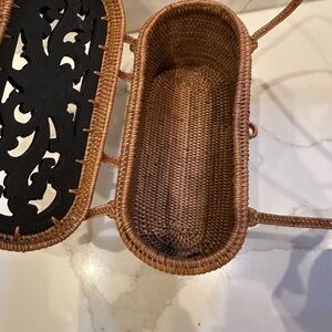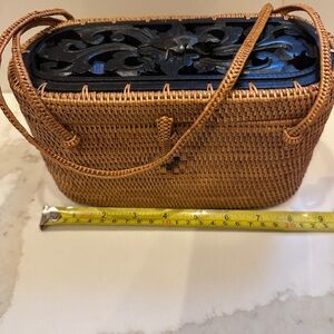 This specialty bag is unique! Check out the intricate carving on top with a lizard! I purchased it new many years ago and have kept it in pristine condition. There is no brand or tag, but it strongly resembles the Lokatan craftsmanship. Dimensions are in the photos. Thank you for looking!
