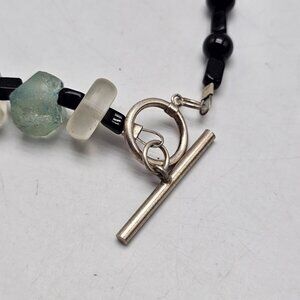 This necklace showcases a unique blend of recycled glass and black beads, creating an eco-friendly accessory. Its toggle clasp ensures secure wear, while the 21-inch length offers a striking look.