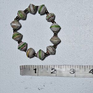 Handcrafted Recycled Paper Bead Bracelet Green Yellow Accents Eco Friendly Women