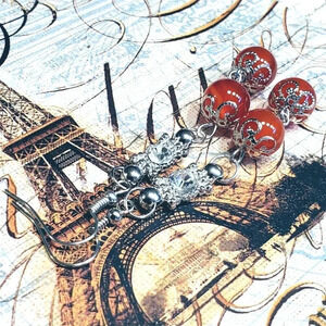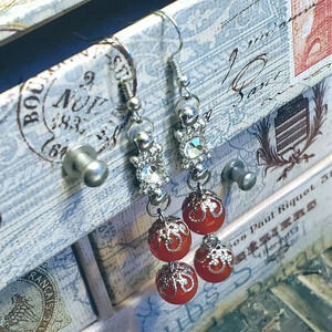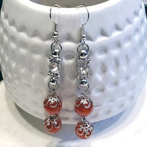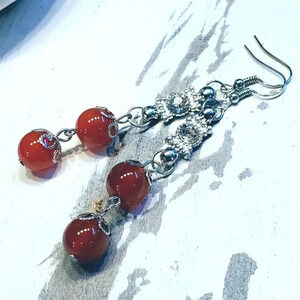 Handcrafted Red Carnelian Gemstone Lacy Silver Clear Crystal Dangle Earrings