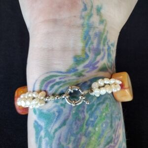 This handcrafted bracelet features striking red and cream Shells, with pearl strands. The unique design makes it a standout piece in any jewelry collection. All questions welcome!