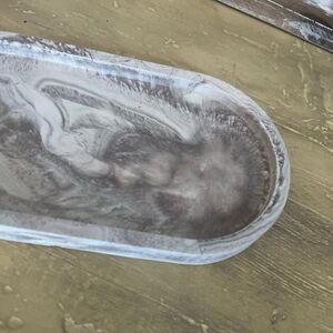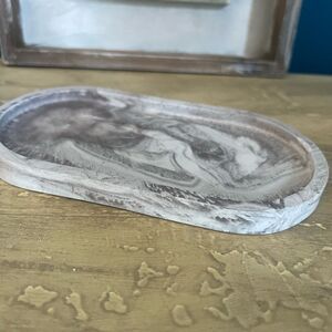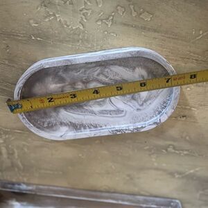 Handcrafted resincrete oval tray handmade with a unique mineral and water-based, eco-friendly casting powder that has a porcelain-like finish. This one is tan/beige with bronze swirls. This has so many uses from using it to store your daily jewelry, it can be used to burn real wax candles, use as a spoon rest and even place a small potted plant on it. It’s made of natural minerals and is non toxic. Heat resistant up to 390 degrees. To clean, simply wash with a soft cloth, warm water and a very mild detergent or glass cleaner. May have slight imperfections that only add to its unique beauty.