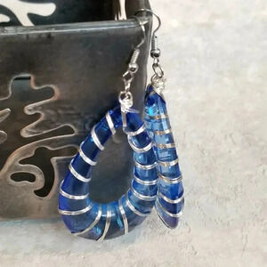 Handcrafted Retro 80s Statement Blue Lucite Open Teardrop Wire Wrapped Earrings