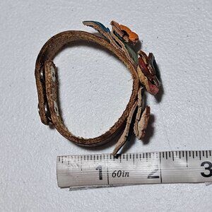 This handcrafted leather cuff bracelet features vibrant floral accents and an intricate design. Its adjustable snap closure ensures a comfortable fit for various wrist sizes.