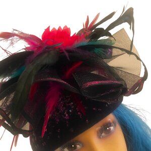 Handcrafted bohemian glammed-up round black felt hat fashioned with tulle, flowers, black, red and turquoise feathers. Ideal for special occasions, reunions, cocktail parties, festivals, Kentucky Derby.