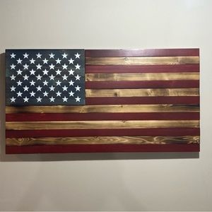 36.5x19.5 inches handcrafted rustic American flag. Well put together and made to last, you can put it anywhere you’d like. It is also well packaged and cared for.