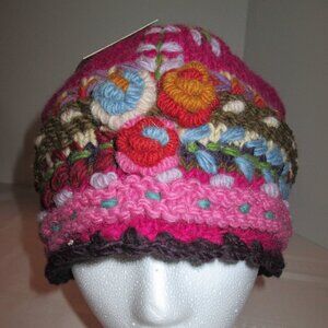 This unique beanie showcases a vibrant hand-embroidered floral pattern, giving every piece its own personality. The scalloped crochet brim adds a charming, artisan touch that sets it apart from mass-produced winter hats.