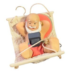 This handcrafted ornament features Santa Claus taking a break from his annual journey, relaxing in a hammock with a TV remote in hand. The ornament's playful design and quality craftsmanship make it a memorable addition to any holiday collection and a delightful gift for those who cherish holiday traditions.
