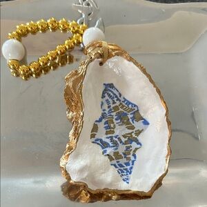 Beautiful blue shell decoupaged on an oyster shell. Hand painted with gold leaf edging. Comes with gold and white beads to hang it. These make great gifts. Hang on a bottle of wine a vase or anywhere. Has a few coats of gloss varnish to protect the paint. These shell are 4 1/2 “ height by 3” width. Comes in a cellophane bag with crinkle cut paper and bow. Made by me.