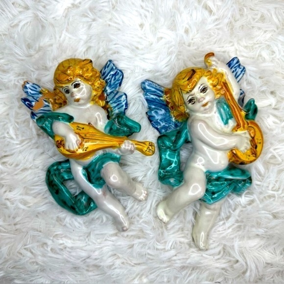 Handcrafted Sicilian Italy Art Pottery Two Cherubs with Mandolin and Banjo