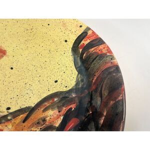 Beautiful, rare, handcrafted, signed E. Bush 9 in decorative plate featuring a vibrant rooster design in rustic country style. The speckled yellow background complements the bold red and black rooster motif, creating a striking piece of kitchen art. Perfect for farmhouse decor, country-style kitchens, or as a unique wall accent. This charming piece adds character to breakfast nooks, dining rooms, or any space needing a touch of rustic charm.