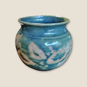 Handcrafted Signed Pottery Vase 4.5" H X 6" W Green & Beige Glaze Decorative Han
