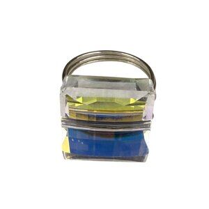 This handcrafted statement ring features an exquisite crystal centerpiece wrapped delicately with silver wire, creating a bold, one-of-a-kind design. Its modern yet artisanal construction speaks to a blend of vintage elegance and contemporary craftsmanship. With an iridescent crystal that shimmers in hues of yellow and blue, this piece is a true eye-catcher, embodying a vintage-inspired look reminiscent of early 20th-century costume jewelry trends. The ring measures approximately a size 5.5 ensuring a comfortable fit for many. Each turn of the wire exudes attention to detail, highlighting the artistry behind the ring. An excellent accent piece for collectors and jewelry enthusiasts looking for a unique addition to their collection.