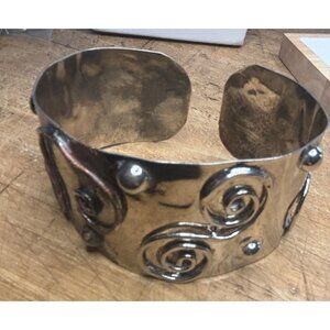 This bracelet combines artistry and durability with its handcrafted metal design. The swirl and dot embellishments add sophistication, making it a versatile accessory.