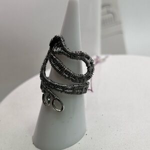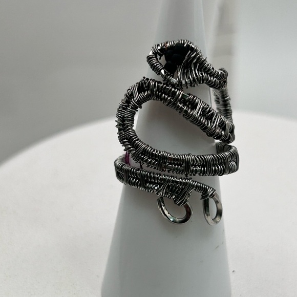 Handcrafted snake ring. Made with stainless steel and gray wire wrap highlighted with black beads for the eyes. The stainless steel shows through the gray wire and sparkles. Very pretty on. Can be worn day or evening.