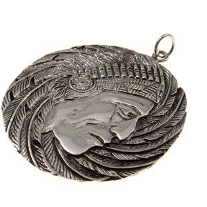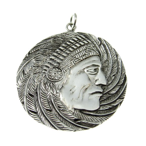 This beautiful pendant is truly unique--a large Indian Chief with headdress with intricate details throughout the medallion. At over 20 grams and measuring over 2 inches in length, this is truly a statement piece. Handcrafted in solid sterling silver, this medallion would make an awesome gift or addition to your wardrobe.