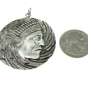 Handcrafted Solid 925 Sterling Silver Giant Indian Chief with Headdress Pendant Medallion