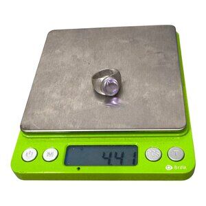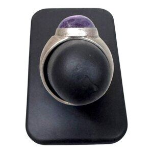 A masterfully designed ring that transcends mere accessory status, offering a sophisticated blend of natural beauty and artisan craftsmanship. The substantial sterling silver setting cradles a mesmerizing amethyst cabochon, showcasing the stone's deep purple hues and subtle translucency.