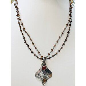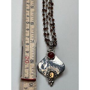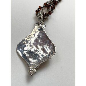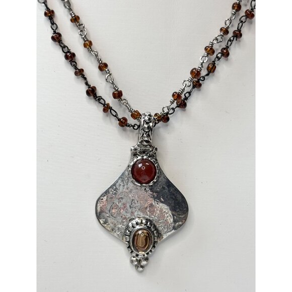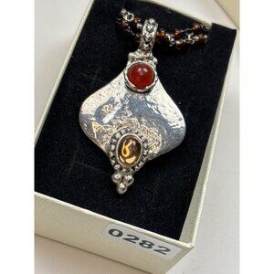 This elegant necklace features a sterling silver pendant with carnelian and amber accents, paired with a beaded amber chain for a refined look.