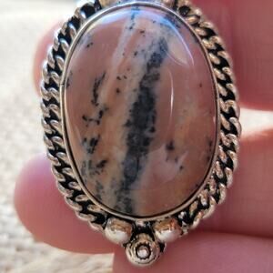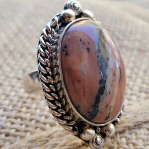 This stunning handcrafted sterling silver ring features a natural rhodochrosite gemstone with soft pink, peach, and black banded patterns. This size 8.5 ring is perfect as a statement piece or a thoughtful gift for someone who loves unique and elegant jewelry.