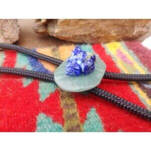 Carved jasper stone frog attached to an agate lily pad fashioned to a silver tone bolo slide