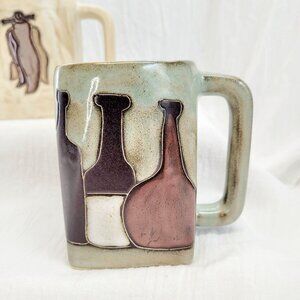 Handcrafted Stoneware Mugs Set Design By Mara Mexico With Chiles / Bottles
