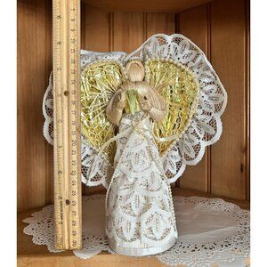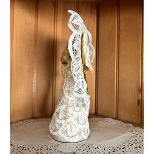 This handcrafted straw and lace angel figurine features intricate lace detailing and gold accents, adding a touch of elegance to any display.