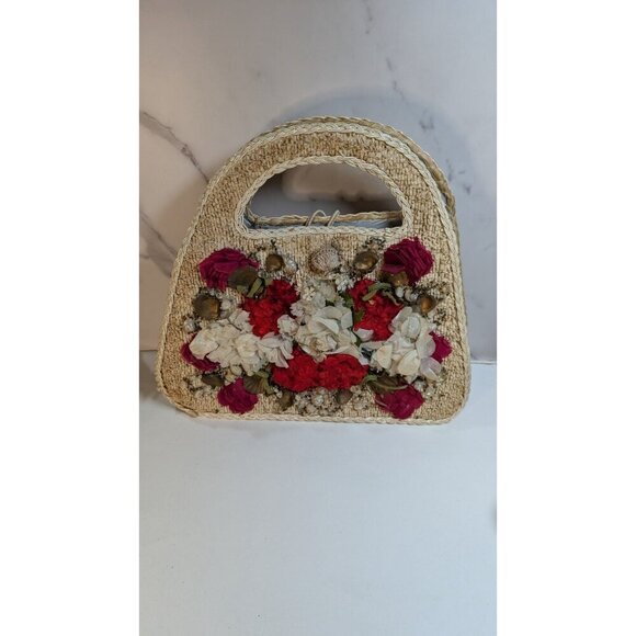 Handcrafted Straw Tote Bag With Floral Embellishments & Dual Handles 15 x 13 x 4