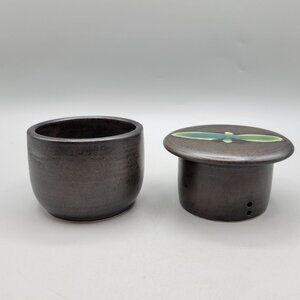 Handmade pottery French butter bell/crock with a beautiful earthy brown glaze. Butter holder top has a blue and green leaf design. Signed by the artist on the bottom - Jaz Rupert?