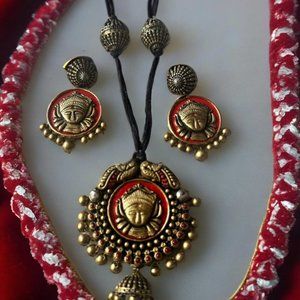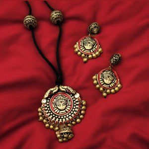Step into a world where traditional craftsmanship meets timeless elegance with this bespoke terracotta necklace and earrings set, reminiscent of India's artisanal legacy. Each piece is hand-sculpted from natural clay, fired, and painted with meticulous attention to detail, offering a unique blend of cultural charm and environmental consciousness.