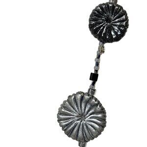 A sophisticated accessory featuring uniquely textured circular pendants and an elegant silver and black beaded design.