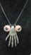 “Watcher’s Reach” is a hauntingly imaginative necklace that blends curiosity with the macabre. Featuring two unblinking blue eyes above a skeletal hand, this upcycled piece captures the feeling of being both the observer and the observed. Suspended on a silver-toned chain, it’s a bold statement for those who walk the line between the mystical and mysterious — daring, aware, and unapologetically unique.