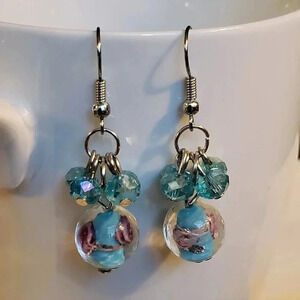 Handcrafted Turquoise Blue Murano Glass Flower Czech Crystal Beads Earrings