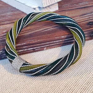 Handcrafted Twisted Rattan Olive Dark Green Silver Bangle Bracelet